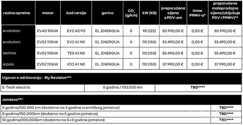 Dostupan je sa svim modernim sustavima pomoći i upozorenja te – što je najvažnije za hrvatske kupce – subvencijama. Osnovna cijena je 30.990 eura, bez subvencije od 9000 eura. Točan cjenik i oprema dostupni su ovdje.