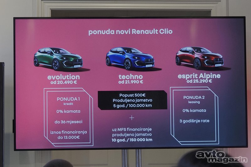I novi Clio izgrađen je na istoj CMF-B platformi kao i njegov prethodnik, no bitno ja povećan, napumpan, opremljeniji je, moćniji, ljepši, tehnološi superioran. Zapravo je odličan, a ni cijena nije prenapuhana. U većini normalnih EU držćava gdje porezi nisu visoku cijana kreće od 19.500 eura, u nas će startna evolution verzija sa 1.2 litarskim benzincem (3 cilindra) od 115 konja kretati od 20.490 eura.
