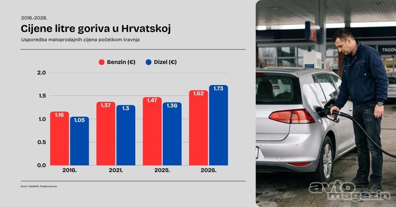 Početkom travnja 2026. litra dizela stoji 1,73 eura, a litra benzina 1,62 eura; takve cijene još nisu na razini rekordnih iz 2022. koje su bile potaknute ratom u Ukrajini, no građani bi svejedno mogli osjetiti razliku u svojem budžetu.